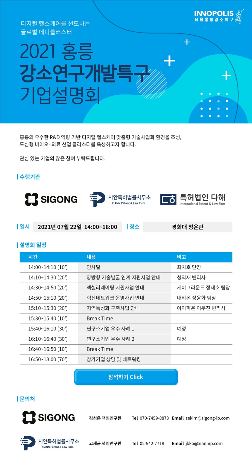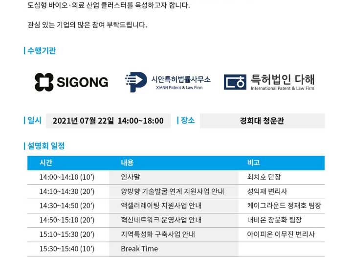 2021 홍릉 강소연구개발특구 기업설명회 교육 모집기간 2021-07-22~2021-07-22 모임기간 2021-07-22, 14시~18시 모임장소 경희대 청운관 지원자격 홍릉강소연구개발특구에 관심 있는 기업 기타 홍릉 강소연구개발특구에 대한 설명회 진행 페이지 정보 작성자 홍릉강소특구사업단 운영자 댓글 0건 조회 215회 작성일 21-11-01 10:12 목록으로 신청하기 본문 상세 정보 목록