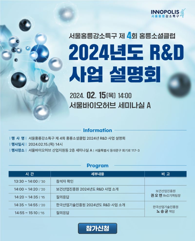 공지 [H클럽] 홍릉소셜클럽 2024년도 R&D 사업 설명회 페이지 정보 작성자 홍릉강소특구사업단 운영자 조회Hit 920회 작성일Date 24-02-14 11:10 본문 . 관련링크 https://docs.google.com/forms/d/e/1FAIpQLSc5RP7F1OfZBiYjbCmrGnvophT57C… 569회 연결 목록 이전글FMI's 3rd Startup Investing Forum 2024 24.03.11 다음글제3회 대웅그룹 이노베어 공모전 24.01.03