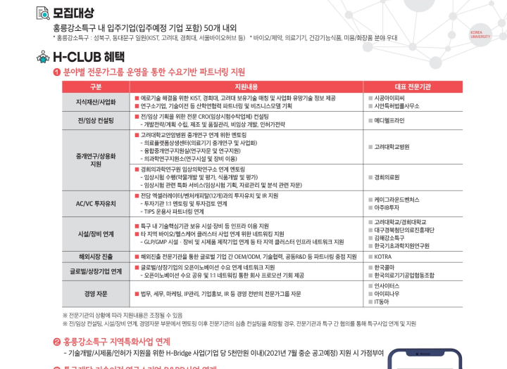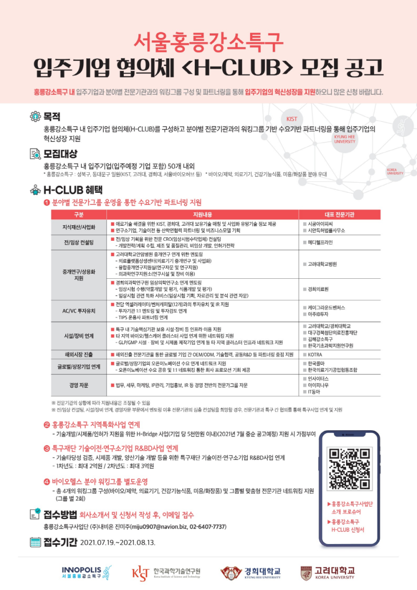 서울홍릉강소특구 입주기업 협의체 <H-CLUB> 모집 협의체 모집기간 2022-07-19 모임기간 상시 모집 진행 중 모임장소 지원자격 홍릉강소특구 내 입주 되어있는 기업 기타 홍릉강소특구 내 입주기업과 분야별 전문기관과의 워킹그룹 구성 및 파트너링을 통해 입주기업의 혁신성장 지원 페이지 정보 작성자 홍릉강소특구사업단 운영자 댓글 1건 조회 307회 작성일 22-01-03 14:15 목록으로 신청하기 본문 상세 정보 목록
