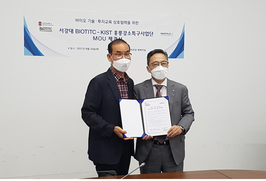 서강대학교 바이오기술·투자전문인력양성센터(BIOTITC, 박경수 단장)와 홍릉강소연구개발특구(최치호 단장)는 바이오 기술·투자 전문 인력 양성 및 지역 산학연정 협력 생태계 구축을 기반으로 바이오산업 발전 및 인프라 구축, 지역 협력 생태계 활성화를 도모하기 위한 업무협력 양해각서(MOU)를 8월 26일 체결했다.