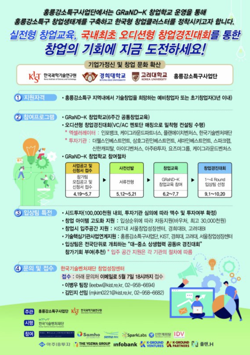 오디션형 창업경진대회는 총 4라운드로 진행되는 경연식 프로그램으로 실제 투자가 가능한 벤처캐피탈(VC), 엑셀러레이터(AC)가 심사위원으로 참여해 각 라운드별 주제에 맞춰 컨설팅을 수행한다. 마지막 라운드에서 최종 입상하는 창업팀은 멘토로 참여했던 투자기관의 투자로 연계할 예정이다. 추가적으로, 입상팀에는 홍릉강소특구사업단 프로그램을 통해 입주, 지원사업연계, 마케팅 활동, 연구소기업 설립 등을 지원한다.