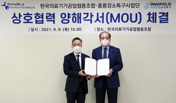 한국의료기기공업협동조합(이하 조합·이사장 이재화)과 홍릉 강소특구사업단(이하 사업단·단장 최치호)은 9일 조합 대회의실에서 ‘의료기기 신기술 사업화의 애로사항 해소 및 국내 의료기기기업의 글로벌 경쟁력 강화’를 위한 업무협약을 체결했다.